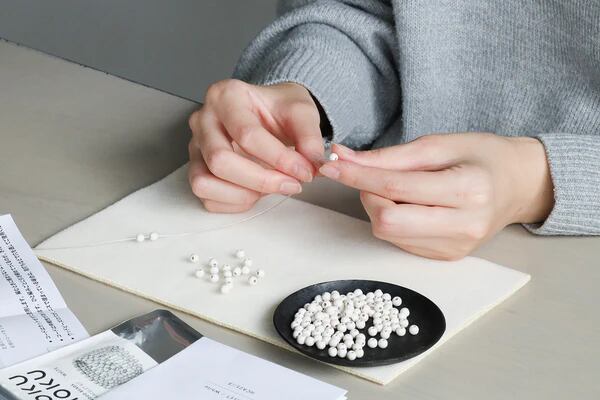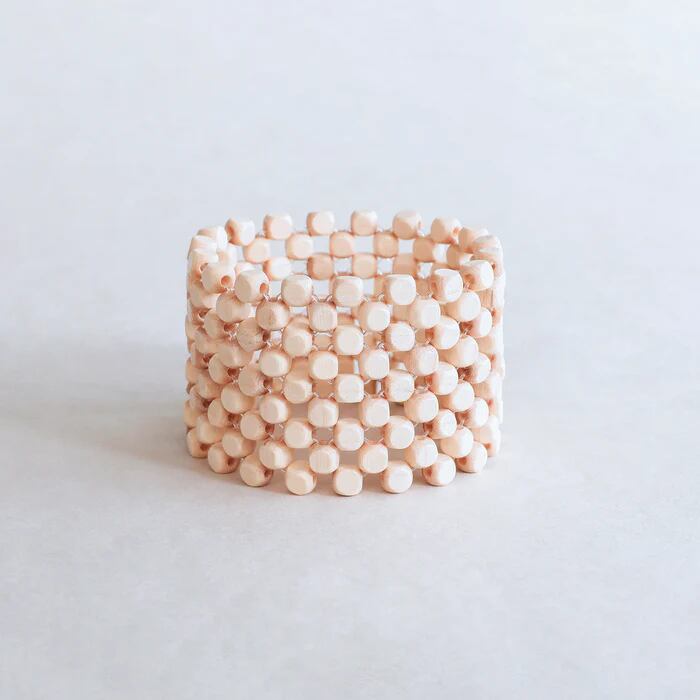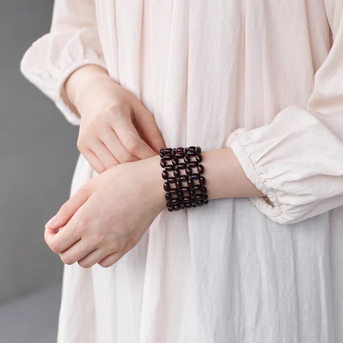 楕円形のウッドビーズでつくる、ブレスレット。ころんとしたビーズでつくられた大きめの網目は、花が連なったようにもみえる。
