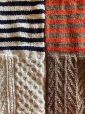 ラムウールで編むネックウォーマーです。糸はしっとりと柔らかく、全くチクチクすることもないためネックウォーマーに最適。柔らかですがアラン模様も綺麗に出ます。半分はアラン模様、半分はボーダーというデザイン。長いままですとふたつの模様を、半分に折って使ってもらうとアラン模様のみ、ボーダーのみでも楽しんでいただける3way仕様。なんだかお得な気分。
