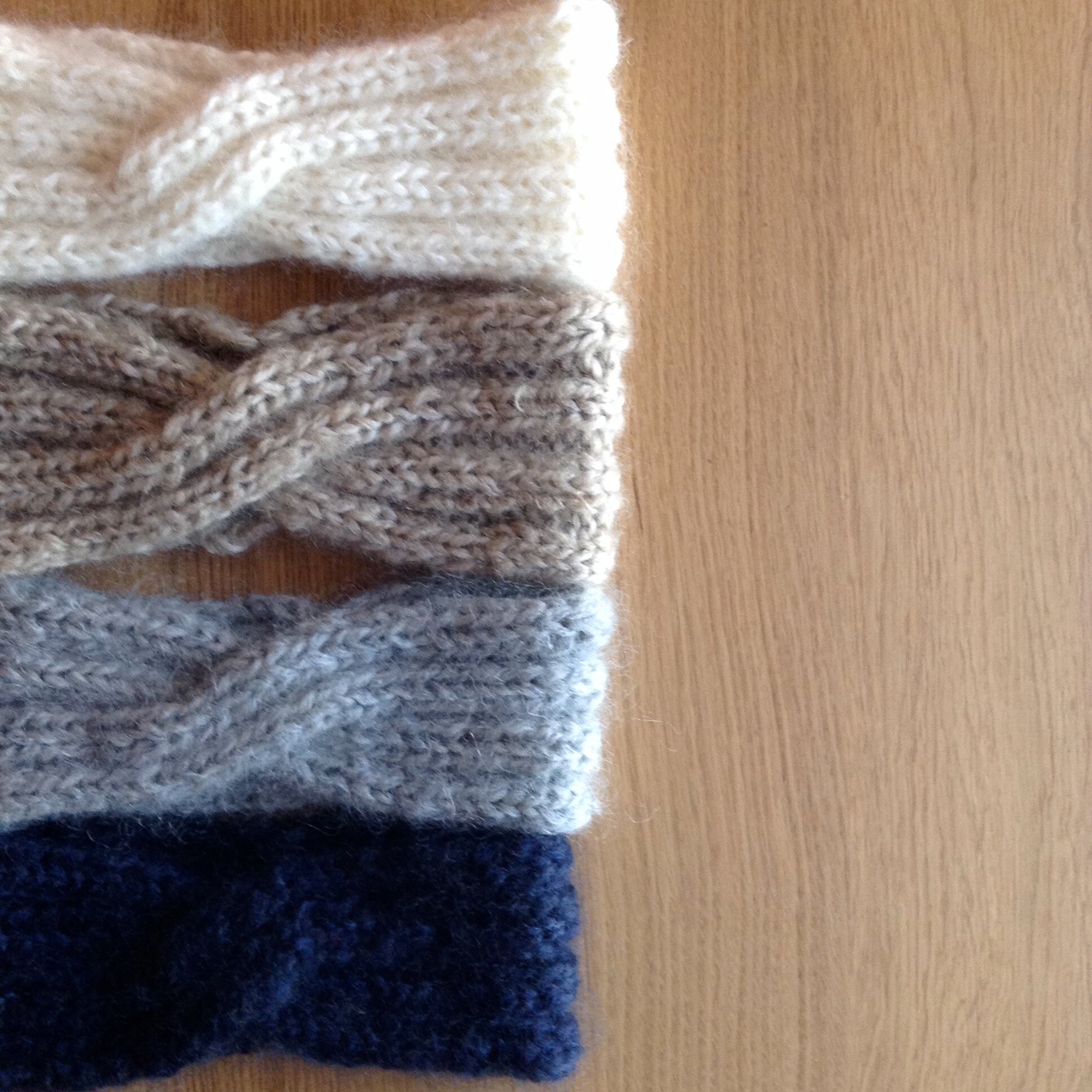 モヘアとウールの糸を2本取りで編むヘアバンドです。軽くて暖か。