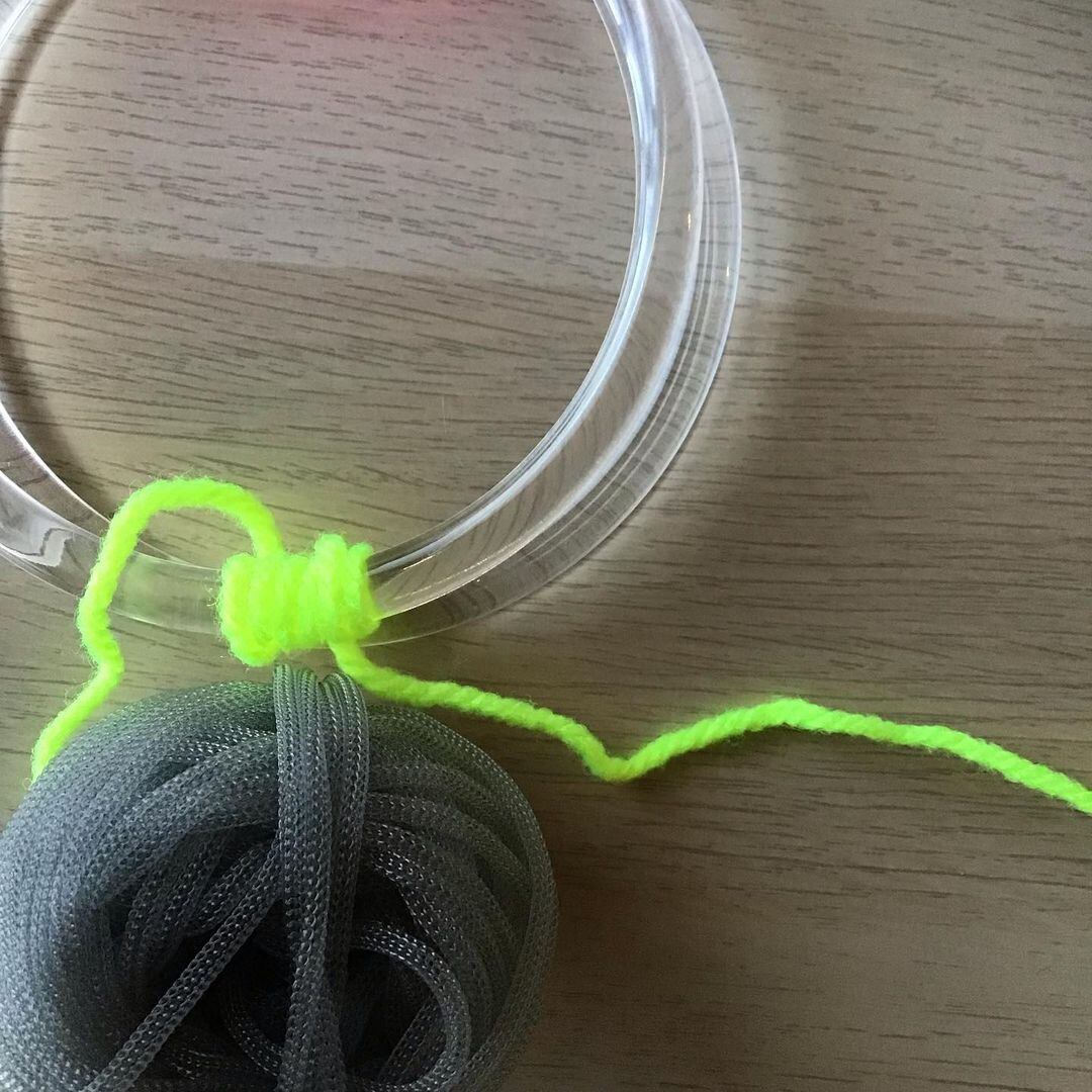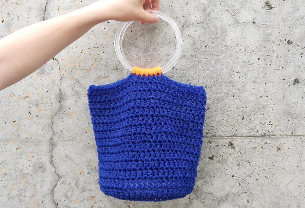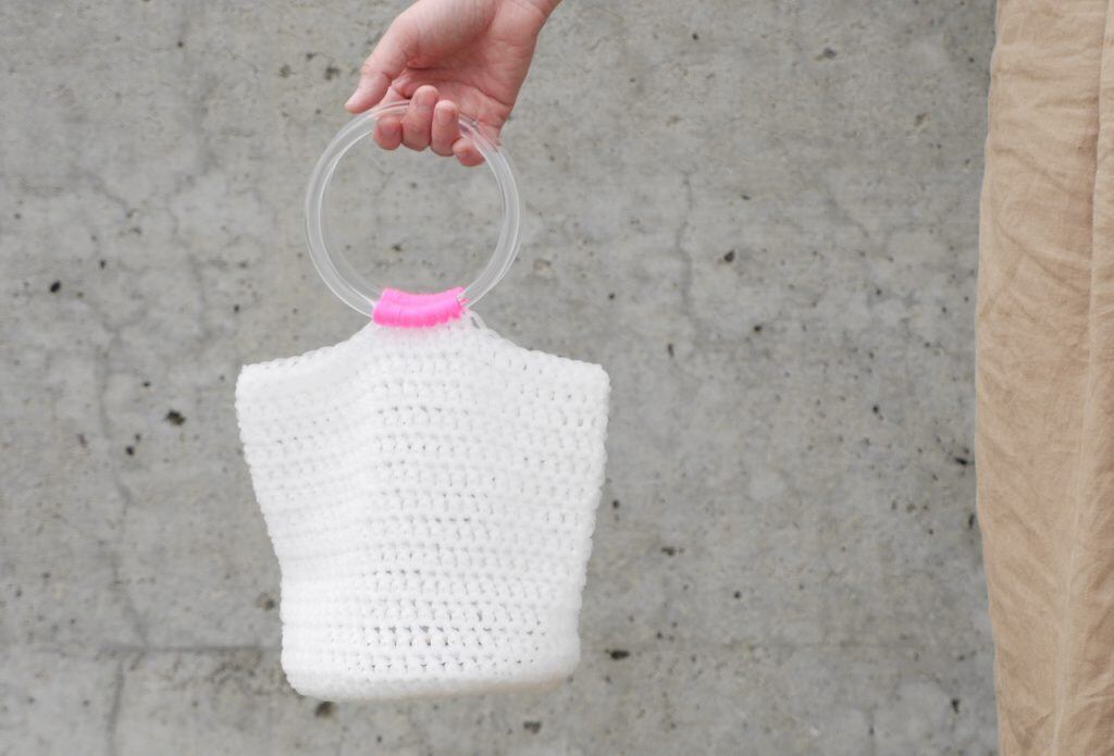本体が編めたらアクリルの取っ手をネオンカラーの糸でぐるぐる巻いてつけて完成。ものを入れると少し伸びますが、伸びた形も可愛いですよ。ぜひ夏の間に編み上げて使ってもらいたいバッグです。底板付き。4色展開です。是非に◎