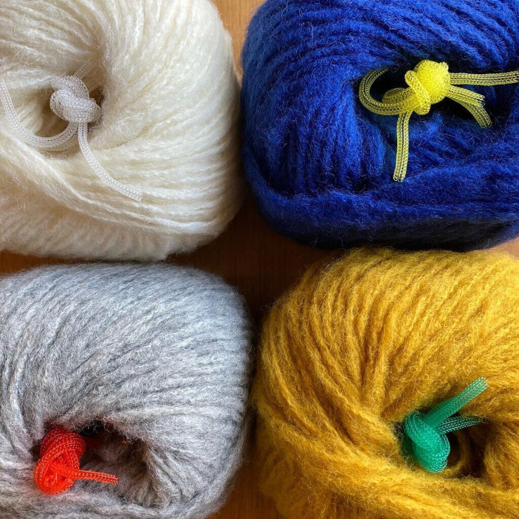 キットには糸、棒針、チューリップさんの針キャップ、編み図がついています。